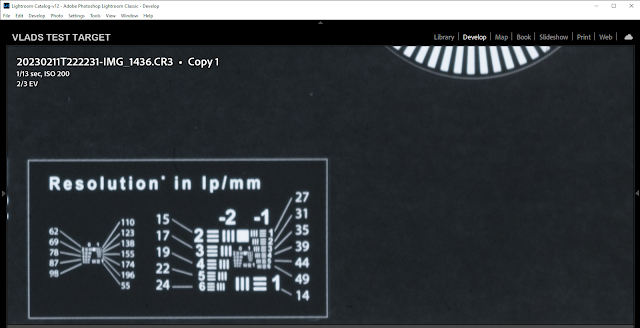 To determine the best shutter speed for scanning, all you need to do is compare the smallest elements on the "Vlads Test Target" in a sequence of shots while observing how they are merged, smudged, or separated. Lightroom's shot comparison feature with scale synchronization makes this process very simple. Conduct this comparison at 100% magnification in a dimly lit room. It's recommended to avoid using 200% magnification as it doesn't provide any additional information (IMHO). By comparing the shots, you will be able to determine with confidence the longest shutter speed you can use without any motion blur. Note that this process should be performed while paying attention to changes in the sharpness of the smallest resolvable element on the target. I tracked the changes in Group 0 Elements 2 and 3.